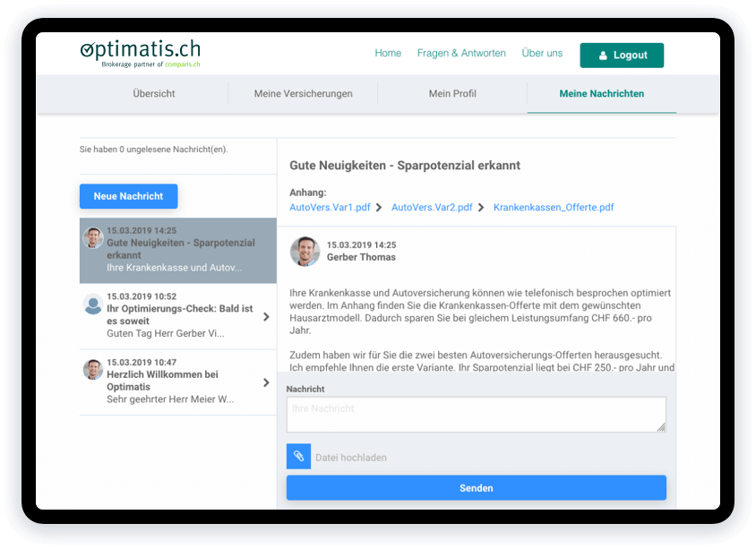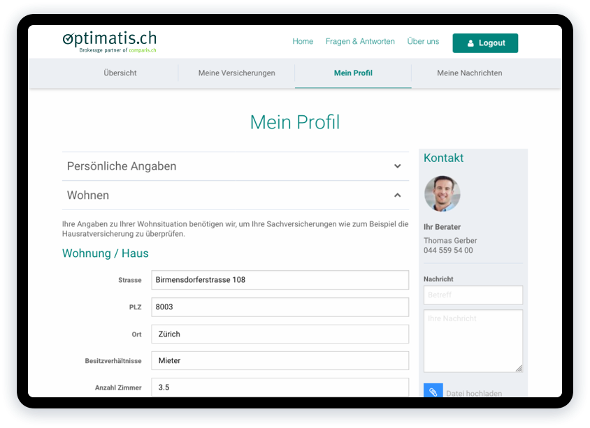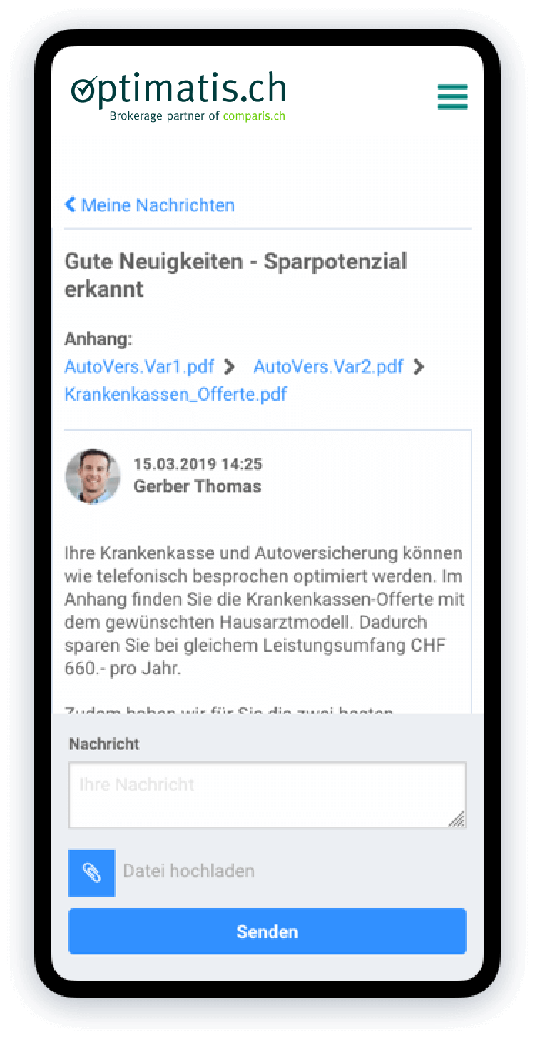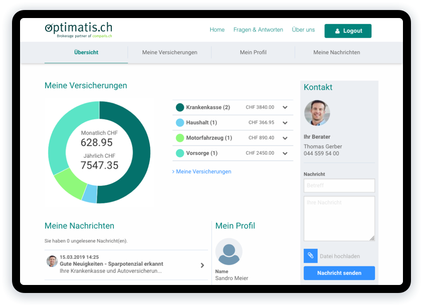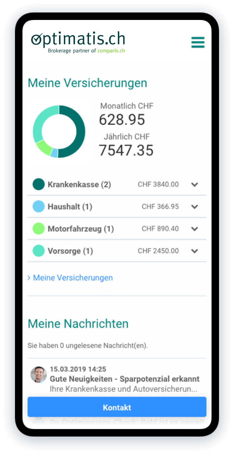 Sparen Sie Geld, Zeit und Nerven: Optimatis findet den für Sie optimalen Versicherungsschutz in den Bereichen Krankenkasse und Vorsorge. Wir ergänzen den digitalen Versicherungsservice von Comparis mit unserer kostenlosen Beratung und treiben gemeinsam eine digitale Abschlussplattform voran.
